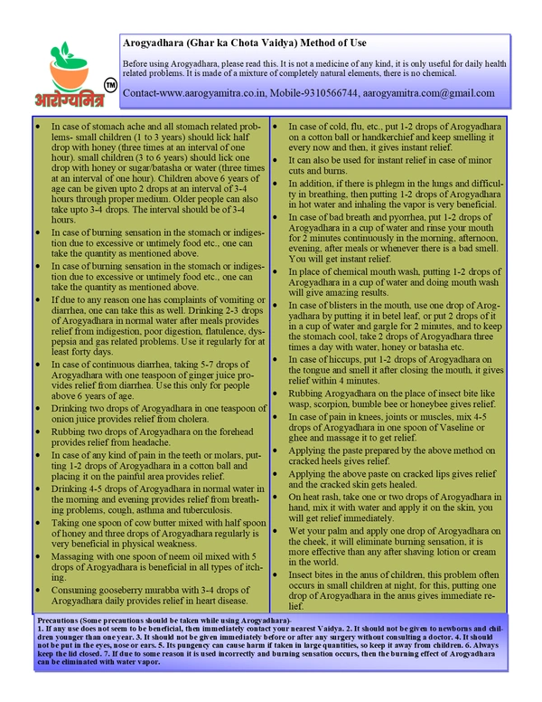 पेट दर्द व पेट संबंधी समस्त समस्याओं में—छोटे बच्चे (१से३ वर्ष तक) आधा बूँद शहद के साथ चटाना (एक-एक घंटे के अंतराल पर तीन बार) छोटे बच्चे (३ से ६ वर्ष तक) एक बूँद शहद के साथ चटाना या चीनी/बताशा या पानी के (एक-एक घंटे के अंतराल पर तीन बार) ६ वर्ष से अधिक आयु वर्ग के बच्चों को २ बूँद तक उचित माध्यम से ३-४ घंटे के अंतराल पर दे सकते हैं। बड़ी आयु के लोग भी ३-४ बूँद तक ग्रहण कर सकते हैं। अंतराल ३-४ घंटे का होना चाहिए। अत्यधिक या असमय भोजन इत्यादि के कारण पेट में जलन, बदहजमी होने की स्थिति में ऊपर बताए गए अनुसार मात्रा ग्रहण कर सकते हैं।y अत्यधिक या असमय भोजन इत्यादि के कारण पेट में जलन, बदहजमी होने की स्थिति में ऊपर बताए गए अनुसार मात्रा ग्रहण कर सकते हैं। किसी कारण से यदि उल्टी या दस्त की शिकायत हो जाए तो भी इसको ग्रहण कर सकते हैं। भोजन के बाद 2-3 बूंद आरोग्यधारा सामान्य पानी में डालकर पीने से अजीर्ण, मंदाग्नि, बादी, बदहजमी और गैस संबंधी समस्याओं में आराम होता है। कम से कम चालीस दिन तक नित्य इसका प्रयोग करें। दस्त लगातार होने की स्थिति में ५-७ बूँद आरोग्यधारा एक चम्मच अदरख के रस के साथ लेने से दस्त में आराम हो जाता है। यह प्रयोग ६ वर्ष से अधिक आयु के लिए ही करें। एक चाय के चम्मच प्याज के रस में दो बूंद आरोग्यधारा डालकर पीने से हैजा में लाभ होता है। दो बूंद आरोग्यधारा ललाट पर मसलने से सिरदर्द में लाभ होता है। दांत या दाढ़ में किसी प्रकार का दर्द होने पर रुई के फाया में १-२ बूँद आरोग्यधारा डालकर दर्द वाले स्थान पर रखने से लाभ होता है। सामान्य पानी में ४-५ बूंद आरोग्यधारा डालकर प्रात: सांय पीने से श्वास, खांसी, दमा और क्षय रोग लाभ होता है। एक चम्मच गाय के मख्खन में आधा चम्मच शहद और तीन बूँद आरोग्यधारा मिलाकर नित्य लेने से शारीरिक कमजोरी में बहुत लाभ होता है। एक चम्मच नीम के तेल में ५ बूंद आरोग्यधारा मिलाकर मालिश करने से सभी प्रकार की खुजली में लाभ होता हैं। आंवले के मुरब्बे में नित्य ३-४ बूंद आरोग्यधारा डालकर खाने से हृदय रोग में राहत मिलती है। | जुकाम, सर्दी, इत्यादि में आरोग्यधारा की १-२ बूँद रुई के फाए में डालकर या रुमाल पर डालकर थोड़ी-थोड़ी देर में सूंघते रहें, इससे तत्काल आराम मिलता है। हल्के फुल्के कटने व जलने पर भी इसका प्रयोग तत्काल राहत के लिए कर सकते हैं। इसके अतिरिक्त फेफड़ों में कफ प्रतीत होने पर और श्वास लेने में कठिनाई प्रतीत होने पर आरोग्यधारा के एक १-२ बूंद को गरम पानी में डालकर वाष्प लेने से बहुत अधिक लाभ होता है। मुख से दुर्गंध आना और पायरिया में १-२ बूँद आरोग्यधारा एक कप पानी में डालकर सुबह दोपहर शाम भोजन के पश्चात या जब दुर्गंध आए २ मिनट तक लगातार पानी को मुख में रखकर कुल्ला करें। तत्काल आराम